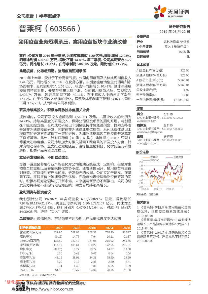 天风证券*公司研究*猪用疫苗业务短期承压,禽用疫苗板块令业绩改善--普莱柯(603566)20190822公司报告半年报点评 1 普莱柯(603566) 证券研究报告2019年08月22日投资评级行业农林牧渔/动物保健6个月评级买入(维持评级) 当前价格16.05元目标价格 元基本数据A股总股本(百万股) 321.50 流通A股股本(百万股) 321.50 A股总市值(百万元) 5,160.01 流通A股市值(百万元) 5,160.01 每股净资产(元) 4.97 资产负债率(%) 11.88 一年内最高/最低(元) 17.38/10.58 作者 吴立分析师SAC执业证书编号:S02 魏振亚分析师SAC执业证书编号:S04 王聪分析师SAC执业证书编号:S01 资料来源:贝格数据 相关报告1 《普莱柯-季报点评:禽用疫苗化药表现优异,猪用疫苗拖累营收增长》 2019-05-01 2 《普莱柯-年报点评报告:18年业绩迅速增加,产品储备丰富助推公司成长》 2019-04-02 3 《普莱柯-公司点评:连获伪狂犬和口蹄疫新兽药证书,产品梯队逐渐完备》 2019-02-02 股价走势猪用疫苗业务短期承压,禽用疫苗板块令业绩改善事件:公司发布2019年半年报,公司实现盈利收入3.20亿元,同比增长12.02%,归母净利润6507.68万元,同比下滑14.86%。